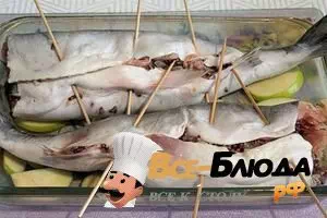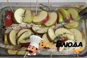 4. На дно жаропрочной формы выложим ломтики яблок. На слой яблок поместим фаршированные тушки рыбы. Польём горбушу лимонным соком, слегка посыплем солью и тархуном. Положим на рыбу и пару веточек чабреца.