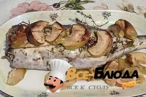 4. На дно жаропрочной формы выложим ломтики яблок. На слой яблок поместим фаршированные тушки рыбы. Польём горбушу лимонным соком, слегка посыплем солью и тархуном. Положим на рыбу и пару веточек чабреца.