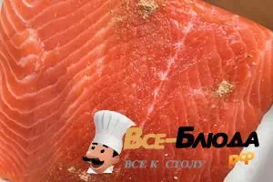 1. Филе красной рыбы (форель, лосось и т.п.) вымыть, обсушить на бумажном полотенце и обильно припорошить смесью соли с молотым сушеным лемонграссом. Оставить в холодильнике на 2 часа.