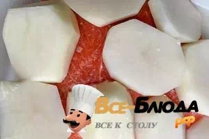 2. Очищенный картофель порезать кружками толщиной 1.5-2 см.