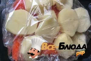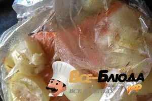 3. Филе красной рыбы переложить в кулинарный рукав. На рыбу выложить картофель и завязать края. Сделать в пакете несколько маленьких отверстий.