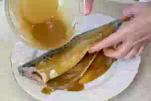 3. Подготовленные тушки скумбрии щедро смазать получившимся маринадом и оставить на 20-30 минут при комнатной температуре. Как раз хватить промариноваться, пока будете готовить картофель для гарнира.