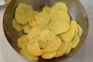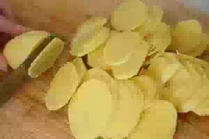 4. Картошку очистить и нарезать пластинами толщиной примерно 5 мм. Чем тоньше нарежете, тем быстрее пропечется картофель. Но использовать для нарезки терку-мандолину не советую.