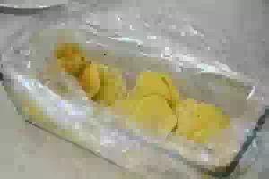 6. В форму для запекания уложить пленку/рукав/пакет для выпечки. На дно пакета распределить нарезанный картофель.
