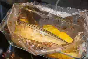 7. На картофель уложить скумбрию. Завязать пакет, сделать в нем небольшую дырочку для выхода пара и поставить в разогретую до 180С духовку на 40 минут. Скумбрия приготовится быстрее, но надо довести до готовности картофель.