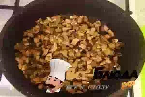2. Грибы помыть, почистить, нарезать кубиками. Сковороду хорошо разогреть. Налить немного растительного масла. Обжаривать на небольшом огне до испарения жидкости и до золотистого цвета. Переложить в салатник к рыбе.