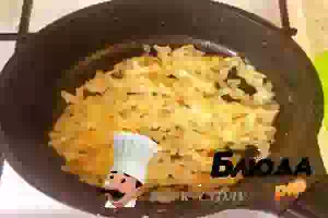 4. Лук почистить, мелко нарезать. Также в той же сковороде хорошо обжарить, до очень насыщенного золотистого цвета, но не пережарить. Т. е., слишком мягкий лук будет ощущаться в салате, а пережаренный придаст всему блюду не нужный нам привкус. По готовности переложить в салатник к рыбе, моркови и грибам.