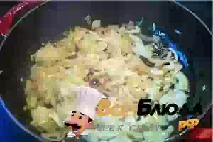 2. В жаровне на оливковом масле обжариваем лук и чеснок.