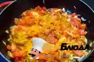 3. Добавляем нарезанные кубиками помидорки, карри и порубленный мелко имбирь.