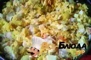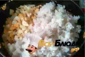 4. Когда это все обжарится, добавляем рис и порубленные яйца, только две штуки, остальные два оставляем для подачи.