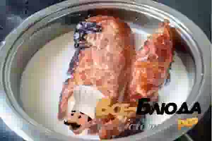 5. Пока обжаривались овощи, припускаем 5-7 минут копчёную рыбу в молоке и разбираем её вилкой на волокна.