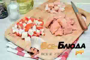 1. Рыбу и крабовые палочки нарезать небольшими кусочками. Креветки очистить и тоже нарезать.
