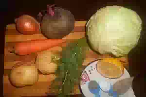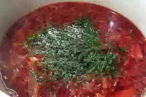 13. В конце приготовления посолите борщ, добавьте сок лимона, перец, зелень петрушки или укропа. Перемешайте и проварите ещё 5 минут. Овощной борщ готов.