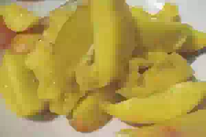 1. Персики помойте и отделите мякоть от косточек. Нарежьте мякоть дольками или кубиками.