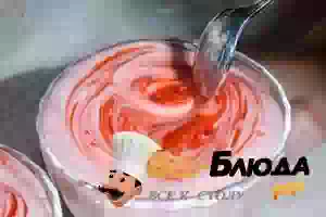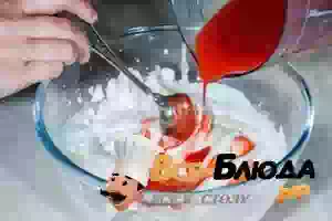 2. Добавить пару ложек клубничного пюре с желатином и осторожно, снизу вверх перемешать. Затем добавить половину пюре, перемешать, влить оставшуюся часть клубничного пюре – перемешать. Можно оставить немного пюре для украшения.