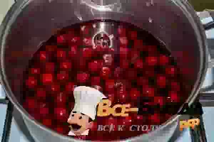 1. Ягоды вишни заранее размораживать необязательно. Залейте вишню водой и включите плиту. Проварите ягоды минут 20, чтобы они отдали свой вкус и аромат отвару.