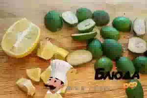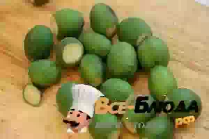 1. Фейхоа вымыть в холодной воде, сложить в дуршлаг и обдать кипятком. Когда вода стечет, переложить ягоды на полотенце, чтобы убрать лишнюю влагу. Срезать у каждого плода кончики, а затем нарезать фейхоа пополам.