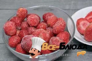 1. Клубнику мыть не надо, она помыта перед заморозкой. Несколько красивых ягод разрежем на четвертинки и уберём в холодильник.