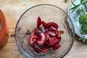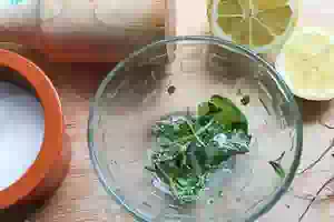 2. Мяту, листики чабера и розмарин укладываем в отдельную тарелку, приправляем соком лимона, толчем и так же засыпаем ложкой песка.