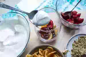 5. В невысокий стакан выкладываем слоями кукурузные хлопья (крупные разламываем), черешню, орехи, творог. Завершаем десерт творогом, по желанию украшаем молотым фундуком и мятой. Перед подачей убираем на несколько минут в холодильник. Хорошее летнее настроение гарантировано!