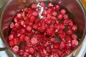 1. Для приготовления мусса или взбитой манной каши возьмите замороженную малину. Залейте ягоды водой и поставьте на огонь кастрюльку.