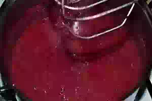 6. Теплую кашу взбивайте миксером в течение 9-10 минут. Вы заметите, как во время взбивания, малиновый мусс становится гораздо светлее.