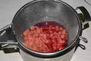 2. Проварите ягоды 10-15 минут при небольшом кипении. Процедите отвар через сито. Деревянной толкушкой протрите ягоды малины через металлическое сито. Семечки для мусса не нужны.