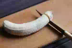 1. Делается шоколадный мусс без сахара очень просто. Нарезаем очищенный спелый банан на кусочки. Если блендер мощный, то можно вообще не измельчать банан вручную.
