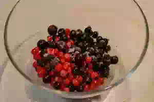 1. Желе можете приготовить из любых ягод: смородины, вишни, брусники, клубники, крыжовника. Залейте стакан замороженных ягод красной и черной смородины питьевой водой и поставьте сотейник на плиту.