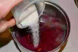 4. Поставьте сотейник с отваром вновь на огонь и всыпьте сахар. Размешайте сахар, чтобы кристаллы растворились.