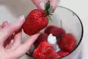 4. У клубники оторвать чашелистики. Ягоды положить в блендер и слегка пюрировать – кусочки клубники должны быть достаточно крупными. Чуть-чуть брызните на них свежим лимонным соком и по желанию посыпьте 1-2 ч.л. сахара. Печенье сложить в пакет и размять скалкой, чтобы получилась крошка, но не пыль.