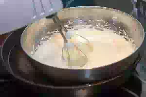 1. Желтки отделить от белков (белки оставить для другого рецепта), добавить сахар и взбивать миксером, пока желтковая масса не станет бледно-желтой, густой, однородной. Перенести миску со взбитыми желтками на водяную баню. Я для этого использую глубокий сотейник. Продолжать взбивать миксером, пока масса не прогреется, при этом постоянно снимайте ложкой желтковую массу с краев миски, чтобы она не успевала присохнуть. Готовый желтковый крем накройте пленкой и дайте ему немного остыть.