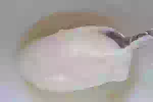 3. Примерно 5г желатина отложить на время в сторону (он понадобится позже для клубничной прослойки). Если желатин быстрорастворимый, то 10г просто развести горячей водой в отдельной посуде. Обычный желатин надо залить водой и оставить набухать согласно инструкции на упаковке. Смешать желатин с 1 ст.л. йогуртово-сырной массой. Затем переложить к остальной творожной основе и хорошо перемешать.
