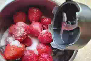 5. Приготовить клубничный слой десерта. Ягоды вымыть, обсушить на бумажном полотенце, удалить чашелистики. Крупную клубнику можно разрезать пополам, мелкую - оставить целой. Переложить клубнику в блендер, посыпать сахаром и пробить в пюре.