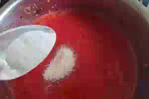 6. Клубничное пюре прогреть, добавить желатин и хорошо перемешать, чтобы не осталось комочков. Клубничную массу слегка остудить.