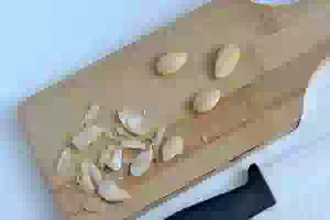 2. Очищенный миндаль заливаем кипятком, оставляем на 3 минуты, а затем очищаем его от коричневой пленочки. Нарезаем очищенные орехи на тонкие пластинки.