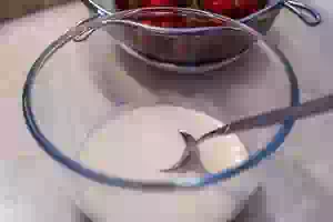 5. К расплавленному желатину добавить несколько ложек ряженки с клубникой, хорошо размешать. Это делается для того, чтобы в десерте не образовалось желатиновых сгустков.