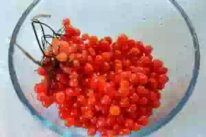 1. Калину собрать после первых заморозков. Ягоды отделить от веток, перебрать, оставив только здоровые, а затем промыть в миске с водой и откинуть на дуршлаг. Дождаться, чтобы вода с ягод стекла почти полностью.