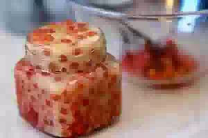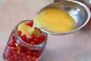 3. Мед должен быть жидкий. Если он уже успел кристаллизоваться, то сначала прогрейте около 200-250г меда на водяной бане. Тонкой струйкой, встряхивая банку с ягодами, наливать мед поверх калины.