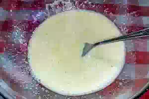 2. Вливаем яичную массу в миску с просеянной мукой, вымешиваем однородное тесто. Оно должно легко стекать с ложки.