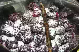 1. Делим ванильную палочку по длине и выскабливаем ножом семена. Укладываем ежевику, ваниль (семена + палочка) и 2 ст.л. сахара в кастрюлю и подогреваем на небольшом огне. В процессе подогрева, слегка прижимаем ягоды ко дну венчиком. Дадим слабо покипеть около 5 минут. Снимем кастрюлю с огня и удалим ванильную палочку.