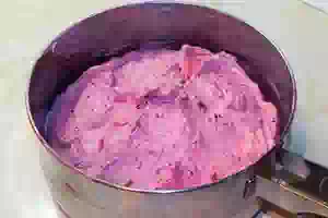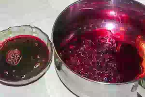 2. Сцедим образовавшуюся жидкость. Её можно употребить как компот. Миксером превращаем ягоды в однородное пюре.