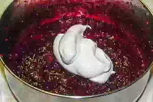 4. Начинаем собирать мусс. В охлаждённое ягодное пюре добавляем 1/3 взбитых белков и размешиваем до однородной массы.
