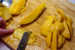 1. Спелое сочное манго разрезать пополам, вырезать косточку, мякоть очистить от кожуры.