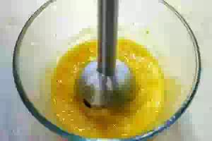 2. Пробить кусочки манго погружным блендером, затем протереть через металлическое сито. Так вы точно избавитесь от волокон, которые попадаются в мякоти даже самого спелого манго.