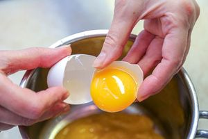 3. Перелить получившееся манговое пюре в небольшой ковш с толстым дном. Добавить к манго яичные желтки, щепотку соли.