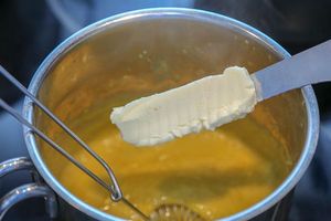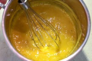 8. После этого снять ковш с готовым курдом из манго с огня и добавить сливочное масло. Перемешать венчиком, разложить по баночкам и дать остыть при комнатной температуре. Если готовите манговый крем впрок, то храните в холодильнике примерно 1 неделю.