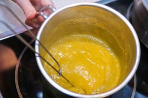 7. Поставить ковш на маленький огонь и варить при постоянном помешивании примерно 15 минут, пока смесь не загустеет и начнет пузыриться.