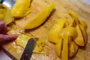 1. Спелое сочное манго разрезать пополам, вырезать косточку, мякоть очистить от кожуры.
