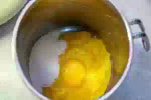 3. Перелить получившееся манговое пюре в небольшой ковш с толстым дном. Добавить к манго яичные желтки, щепотку соли.